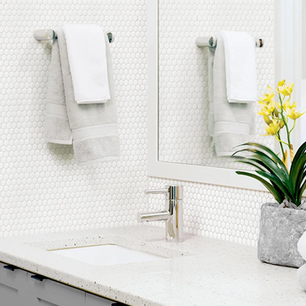This durable, glossy penny round mosaic in classic white is perfect for backsplashes and feature walls in the kitchen, bathroom, shower and more. It’s a flexible design suited for many applications and is made even more stunning because its 1 of the brightest whites you’ll find in tile. The Restore collection has multiple sizes and shapes to suit just about any ceramic wall tile project.
