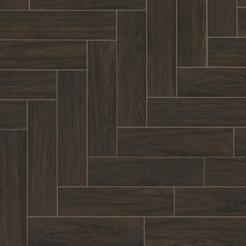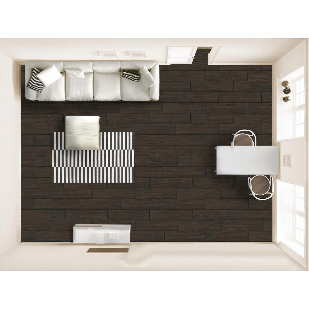 Burlington Walnut porcelain tile replicates the look of a handsome wood plank floor with rich color and bold wood grain. The overall effect is realistic with its hand-scraped grain reminiscent of true lumber. Its variation of deep russet tones set upon a dense porcelain surface is much more easily maintained than any hardwood. Burlington Walnut is the perfect choice for a variety of interiors.