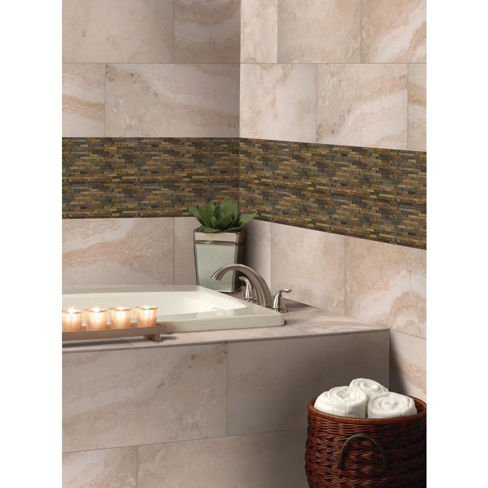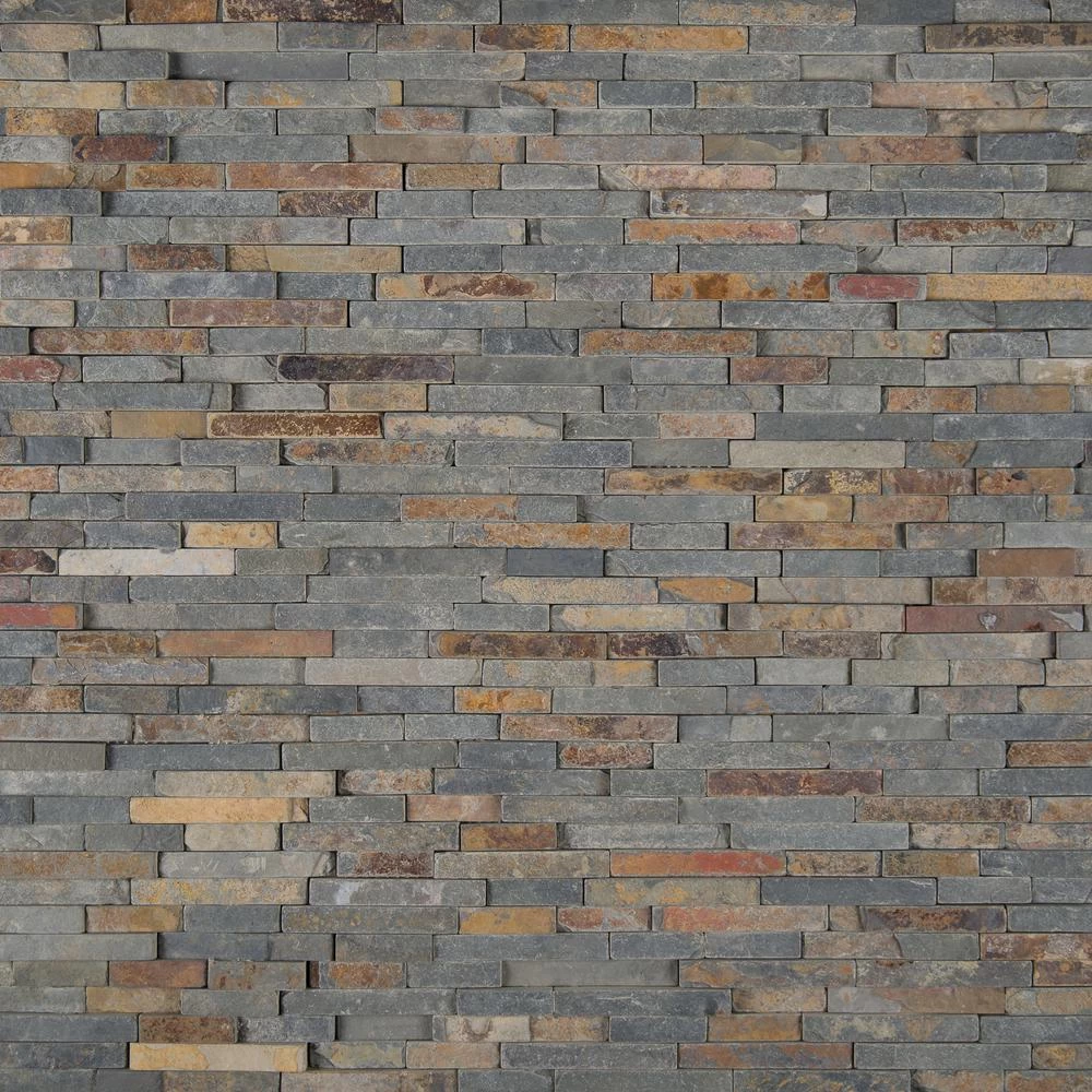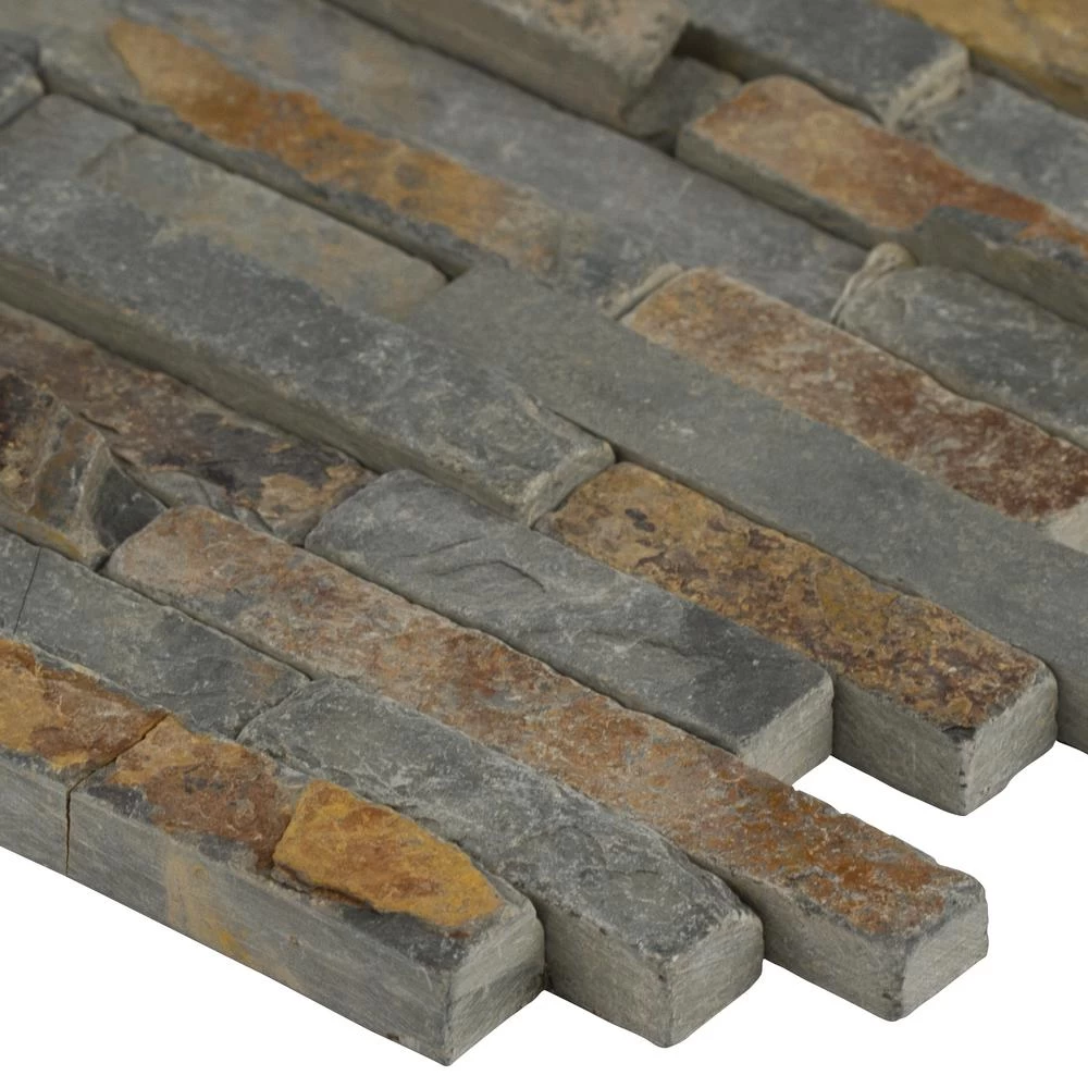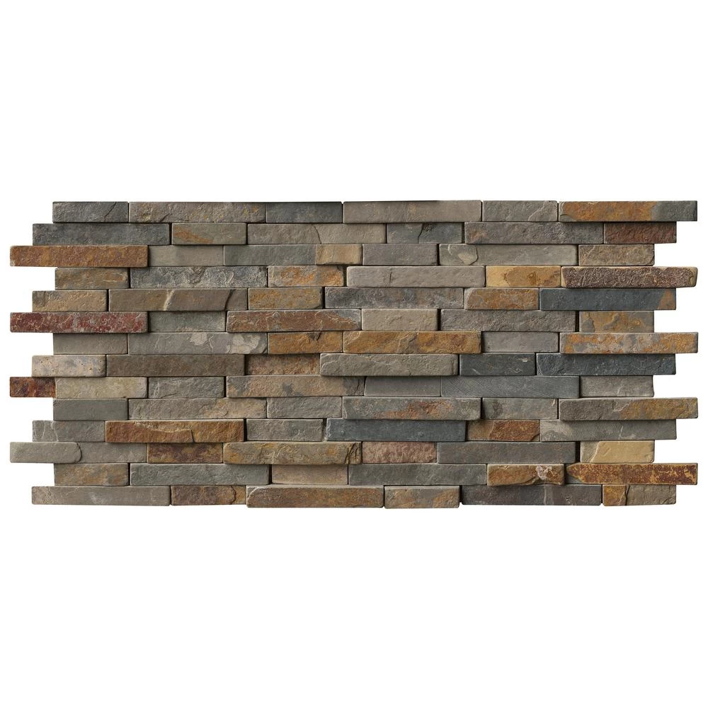 Add a splash of sophistication to your decor with this 8 in. x 18 in. x 10 mm. slate mesh-mounted mosaic floor and wall tile. This Grade 1 tile lends urban flair to your residential or commercial expanse. The attractive tile pieces are sized on a mesh sheet for easy installation. This flooring option features multi-color shades of tumbled natural slate. Natural stone products inherently vary in color, shade and finish and should be secured with a penetrating sealer. Offering supreme style and strength, the vitreous tile absorbs less 3% but more than 0.5% water. Included per case are 10 pieces. Note: Inspect all tiles before installation. Natural stone products inherently lack uniformity and are subject to variation in color, shade, finish etc. It is recommended to blend tiles from different boxes when installing. Natural stones may be characterized by dry seams and pits that are often filled. The filling can work its way out and it may be necessary to refill these voids as part of a normal maintenance procedure. All natural stone products should be sealed with a penetrating sealer.